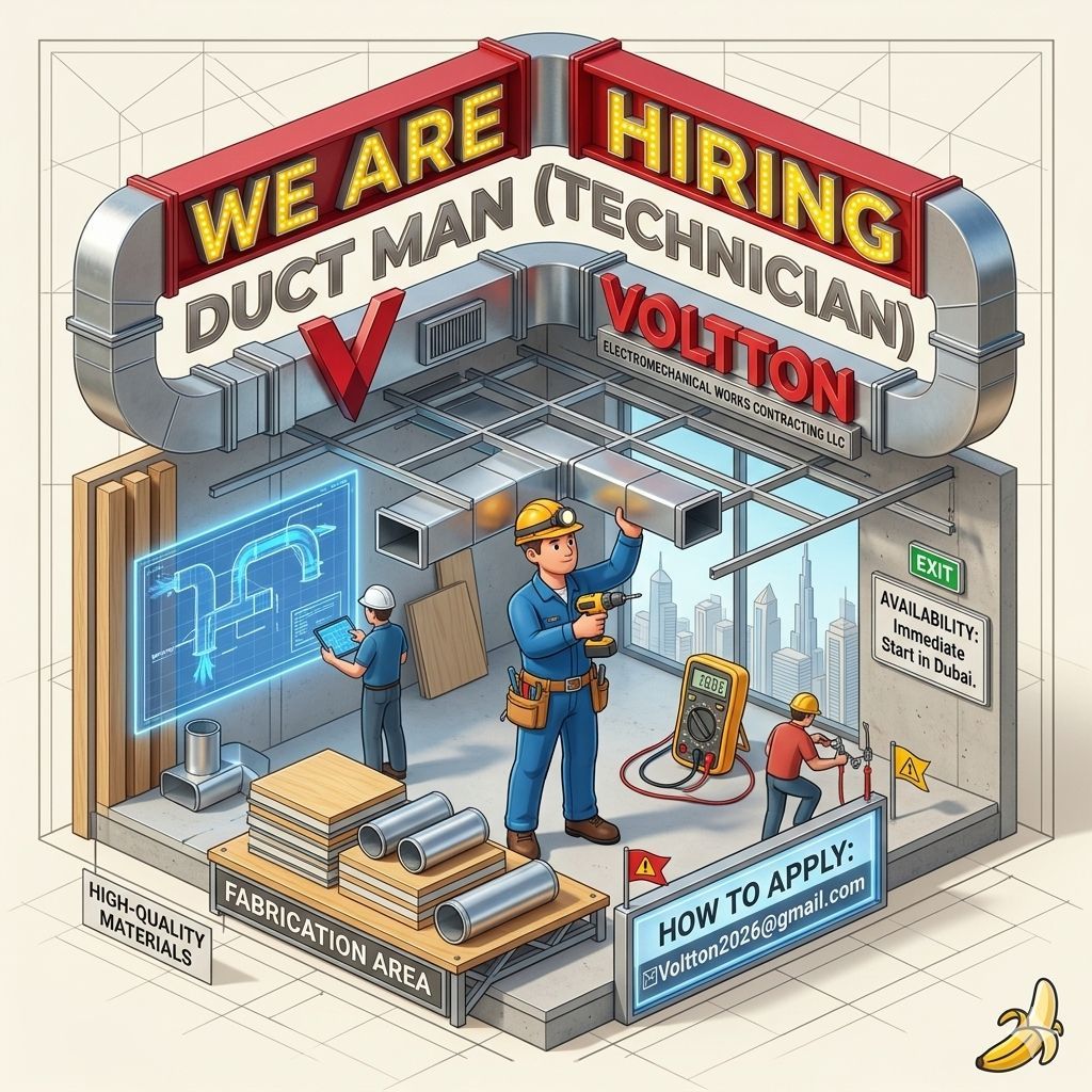 Hiring Duct Man (Technician) VOLTTON Electromechanical Works Contracting LLC is a fast - growing startup in Dubai. As we expand our operations, we are looking for a skilled and reliable Duct Man