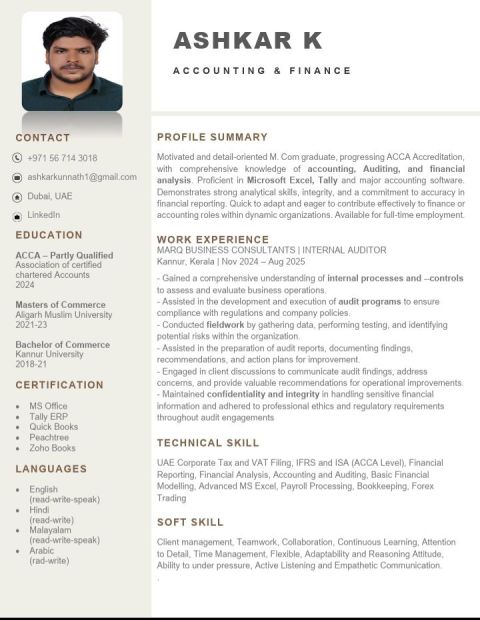 محاسب مصري حديث تخرج تقدير عام ممتاز مع مرتبة الشرف علي معرفة تامة بمبادئ المحاسبة المالية يجيد اعداد القوائم المالية بداية من اعداد شجرة الحسابات الأساسية ومرور الدورة المحاسبية وتسجيلها عبر قيود اليومية وتسويات جردية حتى الوصول لترحيلات الميزانية الختامية واعداد قائمة التدفقات النقدية آخر العام اجادة تامة في استخدام برامج الأكسيل والوورد متواجد ومتاح للعمل في أي مكان داخل دولة الامارات