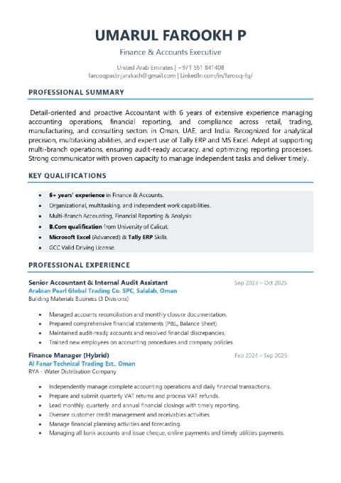 Hi, I hope you're doing well I wanted to reach out as I am currently exploring new opportunities in accounting and finance within the UAE. With over 6 years of experience in finance and accounts, including nearly 3 years in the GCC region (Oman and UAE) I've developed strong expertise in financial reporting, VAT compliance, multi - branch accounting operations, and ERP systems like Tally ERP, etc