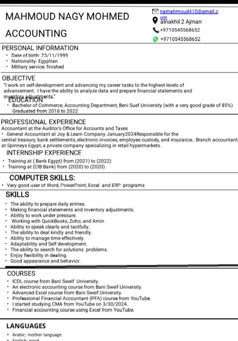 محاسب حديث تخرج لدي خبرة لدي مكتب استشارات محاسبية وحاليا اعمل في شركة عقارات أجيد اعداد القوائم المالية وحساب ضريبة القيمة المضافة والعمل علي برامج ERP SYSTEM & Microsoft Office (Excel) وأجيد التحدث بالانجليزية