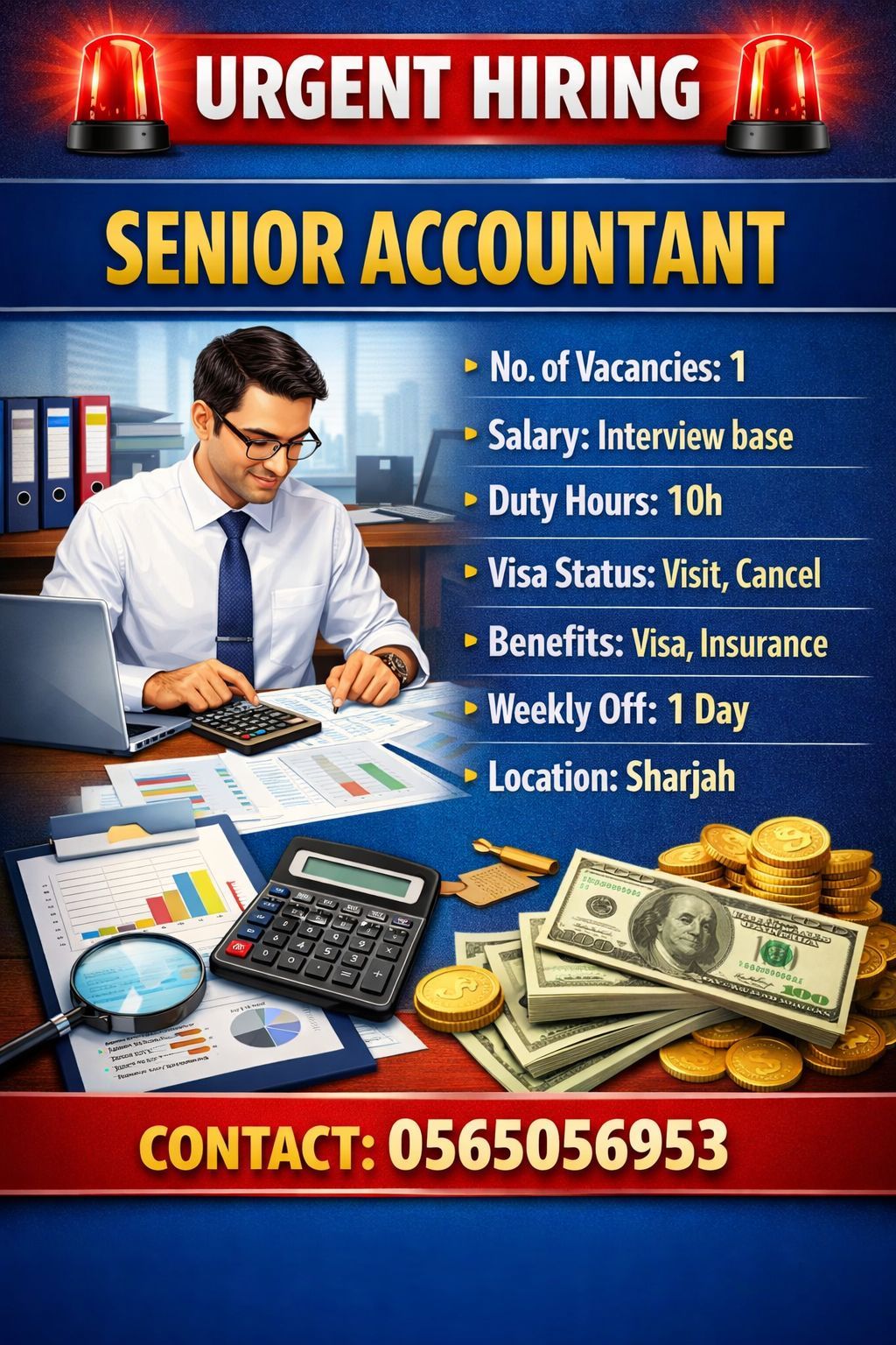 Hello my peoples inside UAE. so right now we are urgently hiring for senior accountant male salary package is 2000 - 2500 basic fixed salary duty hours 9 hour 1 hour break time weekly 1 day off nationality Indian, nepali, Pakistani, Sri Lanka must speak English. accomandation, transport, visa and medical insurance provided by company. location will be in Ajman