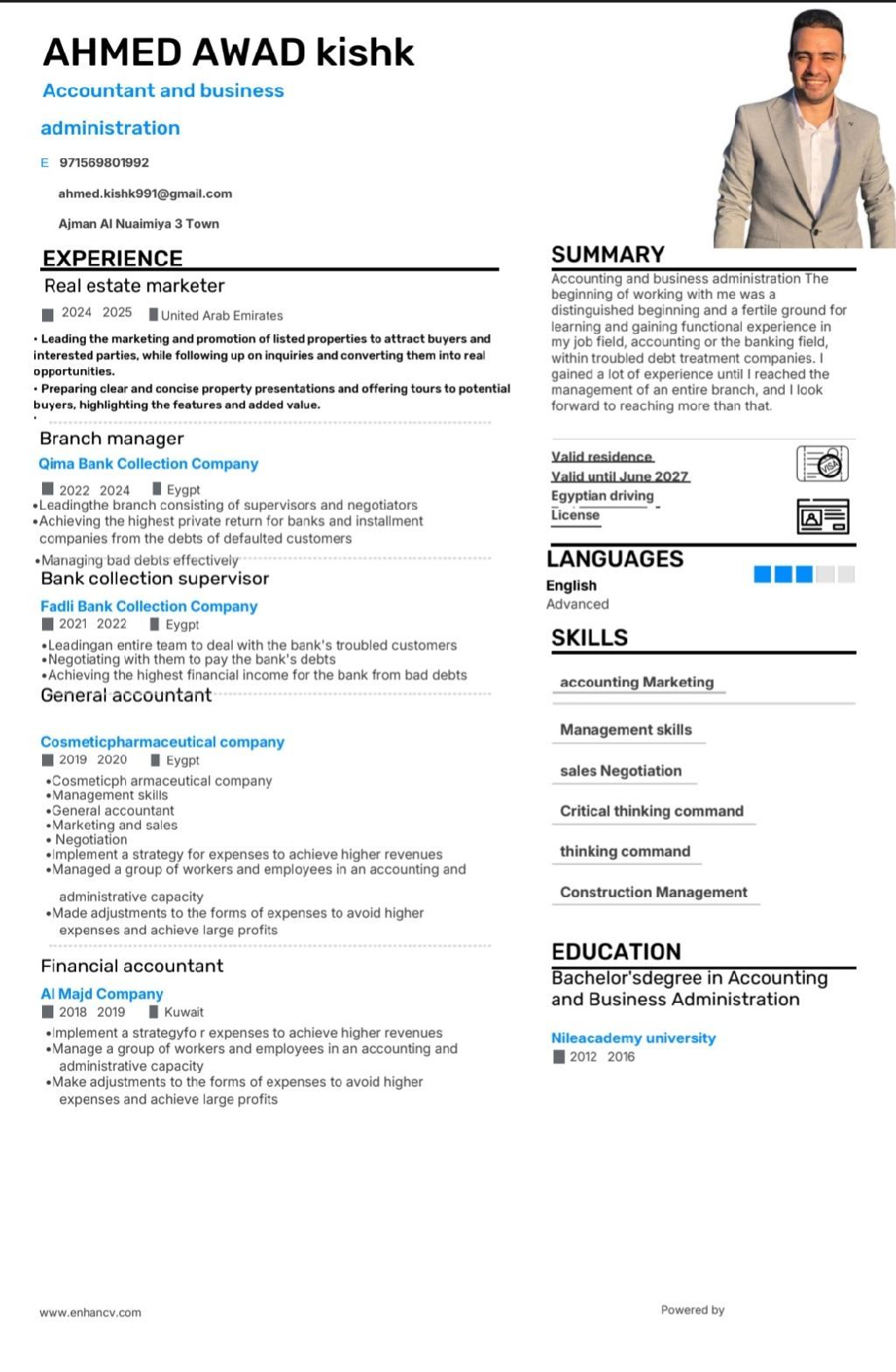 أحمد كشك السن 34 بكالوريوس محاسبه وادارة أعمال مقيم في عجمان ولدي اقامة سارية حتى 8 / 2027 اشتغلت فورمان تشطيبات لمدة 7 شهور واشتغلت مسوق عقاري بشركة عقارات لمدة سنة لدى خبرة بالمحاسبه خارج الامارات ولدى خبرة بادارة الأعمال لمدة أكثر من 5 سنوات اللغة الانجليزي متوسطه