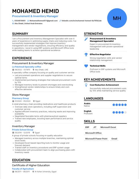 أخصائي مشتريات وإدارة مخزون بخبرة تزيد عن 4 سنوات في الامارات ومصر. خبير في تحسين سلاسل الإمداد وتقليل التكاليف وقيادة الفرق. يمتلك سجلا حافلا في تنفيذ استراتيجيات الشراء، وإدارة المخزون لعدة فروع، والتفاوض مع الموردين. يجيد أنظمة ERP، وأدوات MS Office، ومراقبة مؤشرات الأداء الرئيسية. استراتيجي، مرن، وموجه بالنتائج لتحقيق الكفاءة التشغيلية