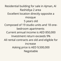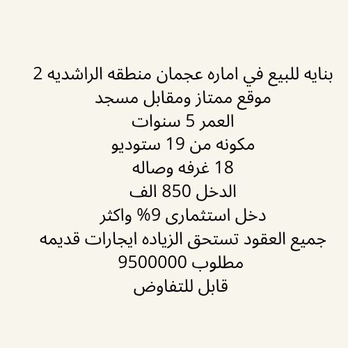 بناية للبيع في إمارة عجمان منطقة الراشدية 2 موقع ممتاز ومقابل مسجد العمر 5 سنوات مكونة من 19 استوديو 18 غرفة وصالة الدخل 850 ألف دخل استثماري 9% وأكثر جميع العقود تستحق الزيادة إيجارات قديمه مطلوب 9500000 قاب بتفاوض ترجمها للإنكليزي