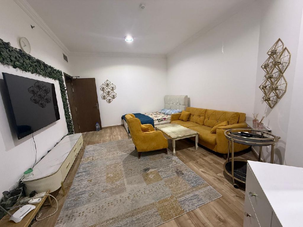 One - bedroom apartment with living room, two bathrooms, and a balcony for sale, fully furnished, in Oasis Towers 2, with a pool view. Features include a swimming pool, gym, and private parking. Apartment size 1149 SqFt. At a very attractive price AED520000 cash only, final price