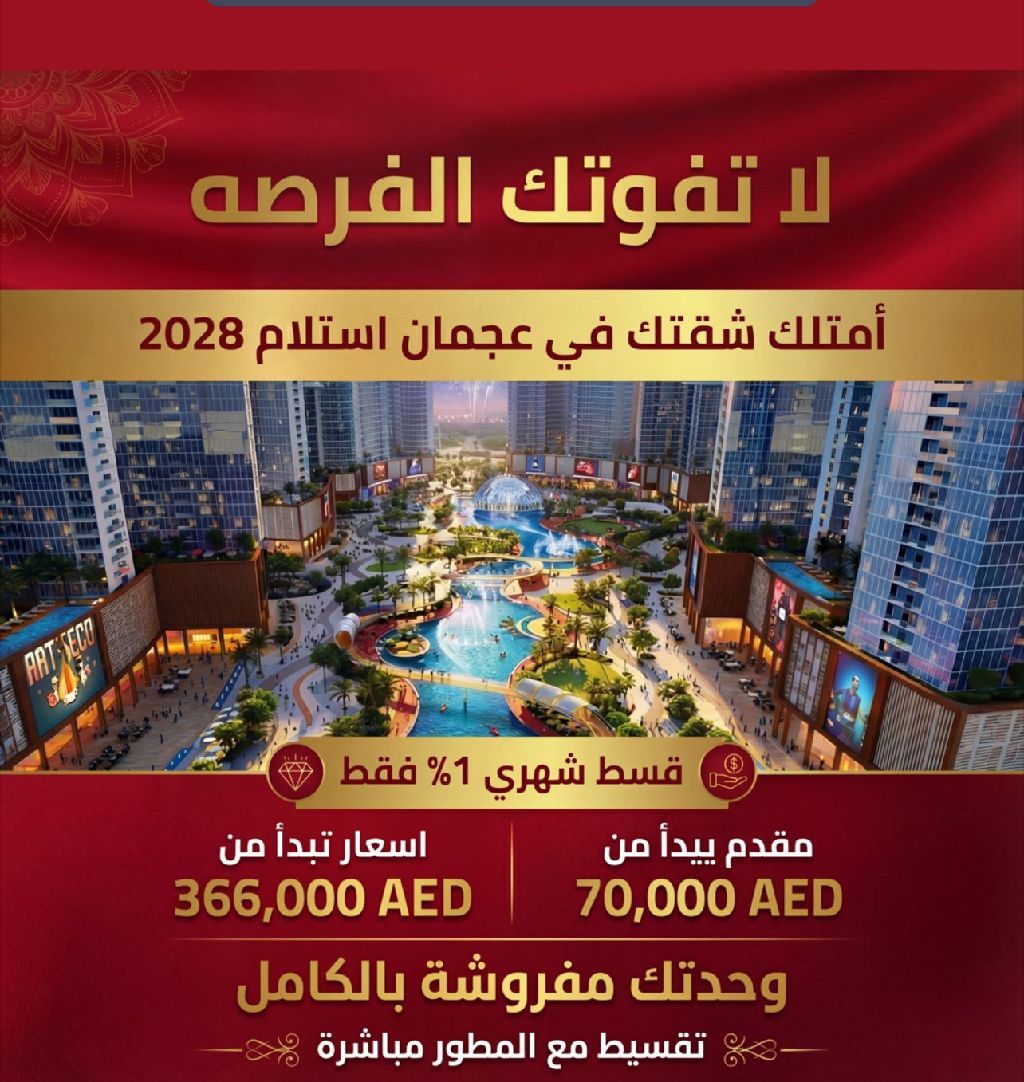 Own your apartment in the heart of Ajman with prices starting from just AED366000. Studios, 1 - bedroom, 2 - bedroom, and 3 - bedroom apartments are available. Studios start from AED366000, and 1 - bedroom apartments from AED610000. Delivery is scheduled for 2028. The apartments come fully finished and offer direct installments with the developer. monthly installments start from just 1%