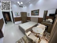 Studio apartment for sale in Princess Village, Ajman, measuring 580 SqFt with a balcony. Suitable for living or investment. Images are for illustrative purposes only. Total price AED355000, down payment AED160000, monthly installment AED2900. Prime location close to essential services and amenities, an excellent opportunity for families or investors