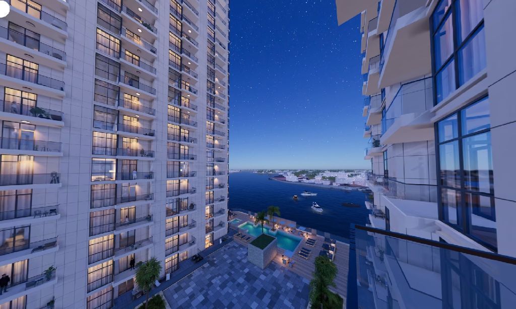 مشروع كريك تاور عجمان الوحدة 10 - غرفة وصالة المساحة 1128 قدم مربع مطبخ مغلق اطلالة كاملة على الكريك + اطلالة على المسبح + اطلالة على الحديقة سعر القدم ممتاز ومناسب جدا للمستثمرين