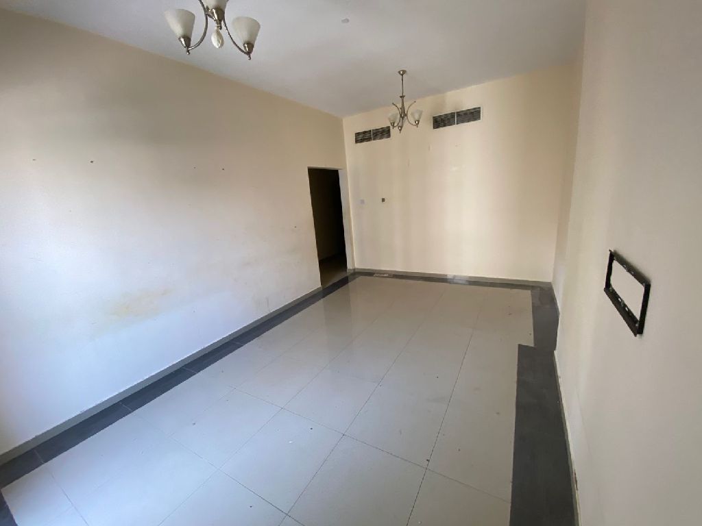 Two - bedroom apartment for annual rent in Ajman, Al Al Nuaimia 1, next to Al Hikma School, with central air conditioning, a large balcony, two bathrooms, and spacious living areas. AED37000 Five check installments Check security deposit