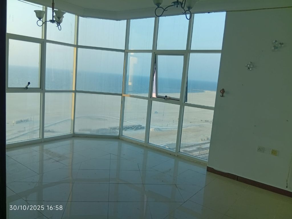 Three - bedroom apartment with a living room for annual rent at AED58000 only, featuring a direct panoramic sea view in a prime first - row location by the beach. The property is close to all main facilities such as shopping malls, schools, and restaurants. The apartment is very spacious with a modern layout and high - quality finishing. It includes a master bedroom with an attached bathroom, a maid’s
