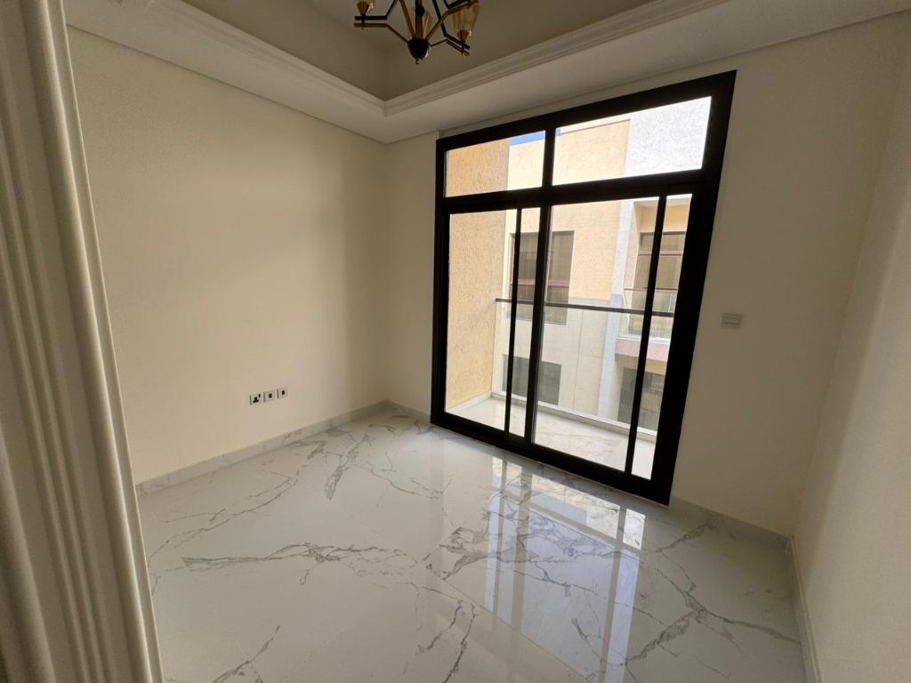 Brand - new apartment for annual rent in Ajman, Al Muweihat, first occupancy, located directly on Sheikh Mohammed Bin Zayed City Street. The apartment features a private swimming pool and is conveniently located next to a school complex. It includes two bedrooms, a living room, a Majlis, an additional sitting area, balcony with a beautiful view, and two bathrooms with modern design and finishes, offering