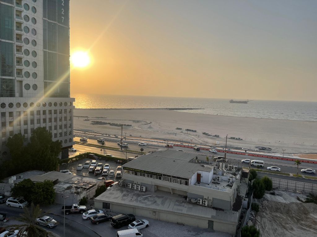 Furnished apartment for monthly rent in Ajman Corniche, featuring a prime location with a stunning full sea view and direct access to the beach. The apartment includes one bedroom, a spacious living room, two bathrooms, and a fully equipped kitchen with all essential appliances, making it an ideal choice for those seeking comfort and a beautiful view. It is ready for immediate move - in and comes fully