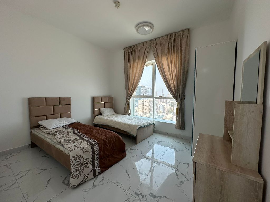 A two - bedroom apartment with a living room is available for monthly rent in Rashidiya Al Waha Towers, Ajman. It features a gym, swimming pool, parking, and an open view. The price is AED7000, all - inclusive