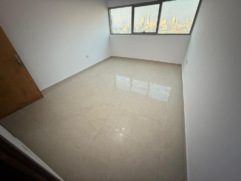 For rent in Ajman, a one - bedroom apartment in Rashidiya 3, very close to the Dubai and Sharjah exit on Khalifa Street. Includes free air conditioning and central gas. Payment options four installments, AED2000 cash deposit (credit report required) Also close to Grand Mall. Features a master bedroom, two bathrooms, and an unobstructed city view