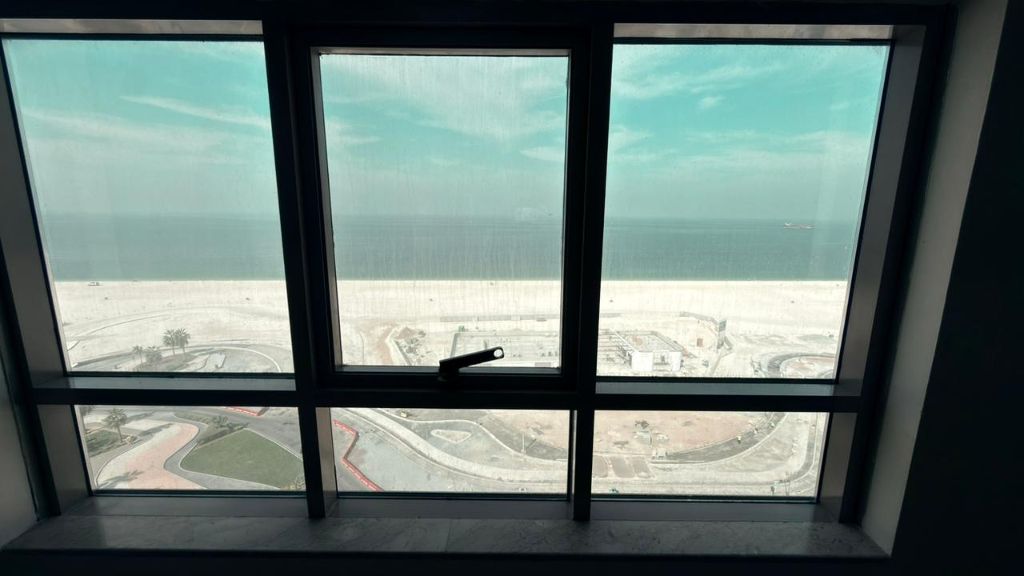 For annual rent in Ajman, a three - bedroom apartment with a living room and storage, featuring high - end finishes and spacious layouts, directly overlooking the sea on Ajman Corniche, next to the Corniche Towers. This brand new apartment includes three bathrooms, built - in wardrobes, a balcony with an open view, a separate living room, excellent layout, ample natural light, central air conditioning