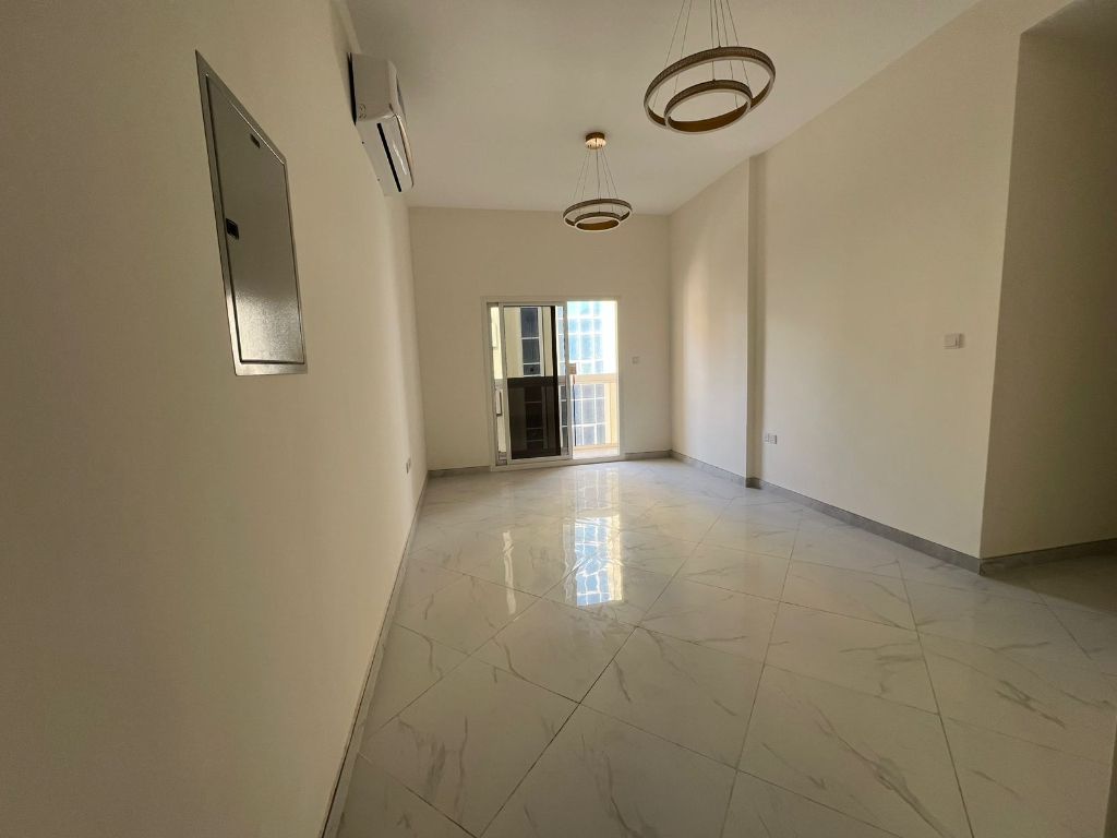 One bedroom and living room, first occupancy, annual rent in Ajman, Al Al Nuaimia 1, Al Ittihad Street. Price AED32000, payable in 6 installments. Security deposit and maintenance fees apply. Features include 2 bathrooms, very spacious layout, excellent for families, a large kitchen, split AC units, balcony, and a prime location close to all services and bus stops, with easy access to Dubai and Sharjah