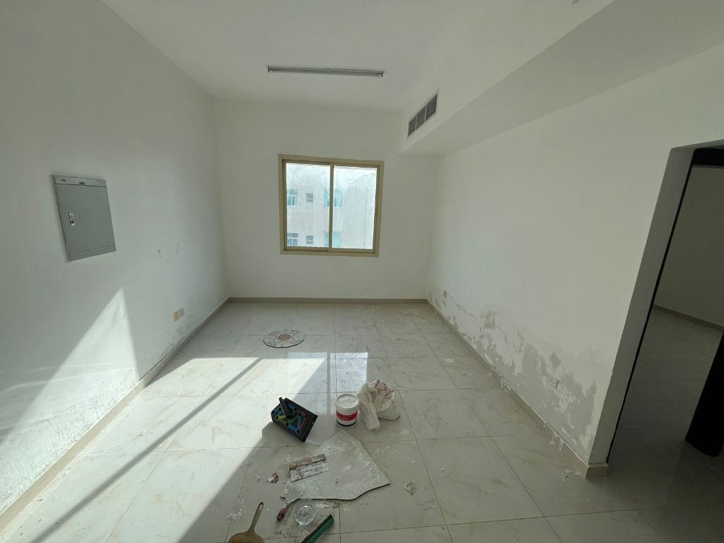 For annual rent - One bedroom and living room in Al Alia, Ajman, near Bait Al Mutawahid. Central air conditioning. New building, second tenant. Annual rent AED27000, payable in 4 installments