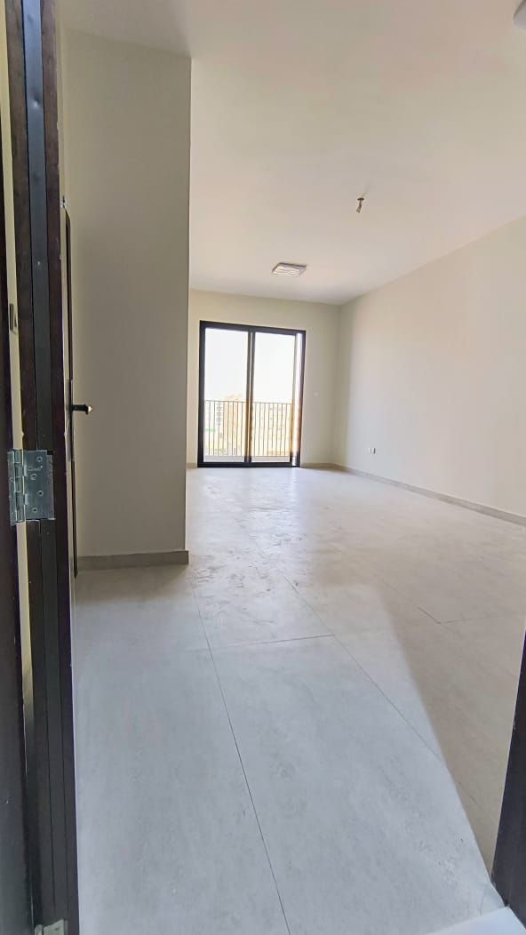 For rent in Al Jerf 3, a first - occupancy apartment with strong specifications, featuring two master bedrooms with very large spaces, a very spacious living room with a balcony overlooking the street, three bathrooms, and a fully fitted kitchen, practical layout ideal for family living, annual rent AED43000