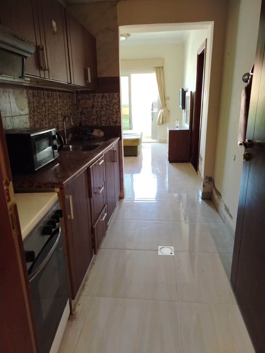 Furnished Studio for rent - Al Jerf 2 Near Al Aqsa School, large size with balcony, semi - separate kitchen, internet included. rent AED23000 per year