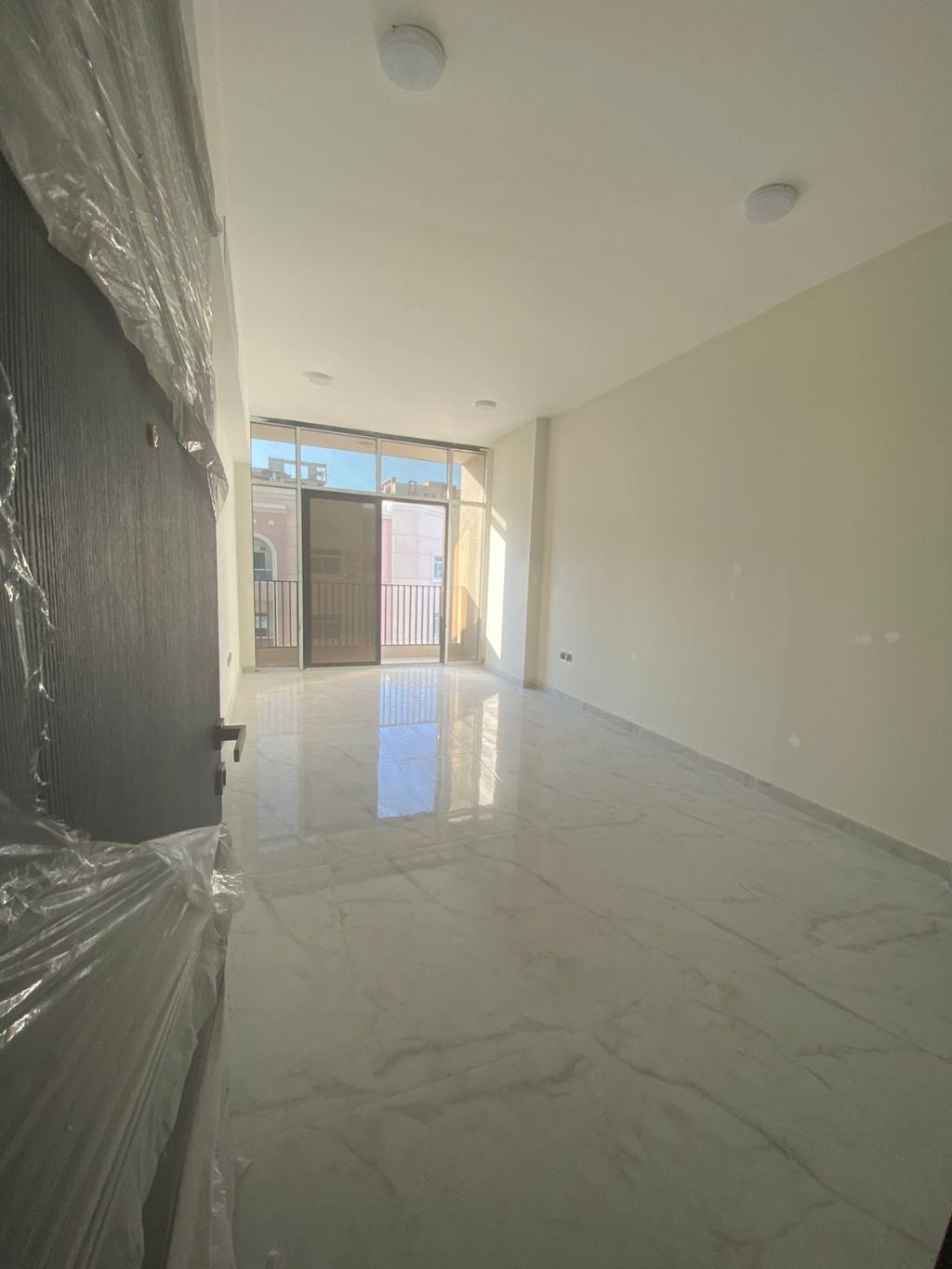 Room and living room with bathroom and balcony. First occupant, super deluxe finish. On cliff 3 on a main street, close to the Chinese market and Mohamed Bin Zayed. Annual rent 33000 in 4 or 6 installments, security by check