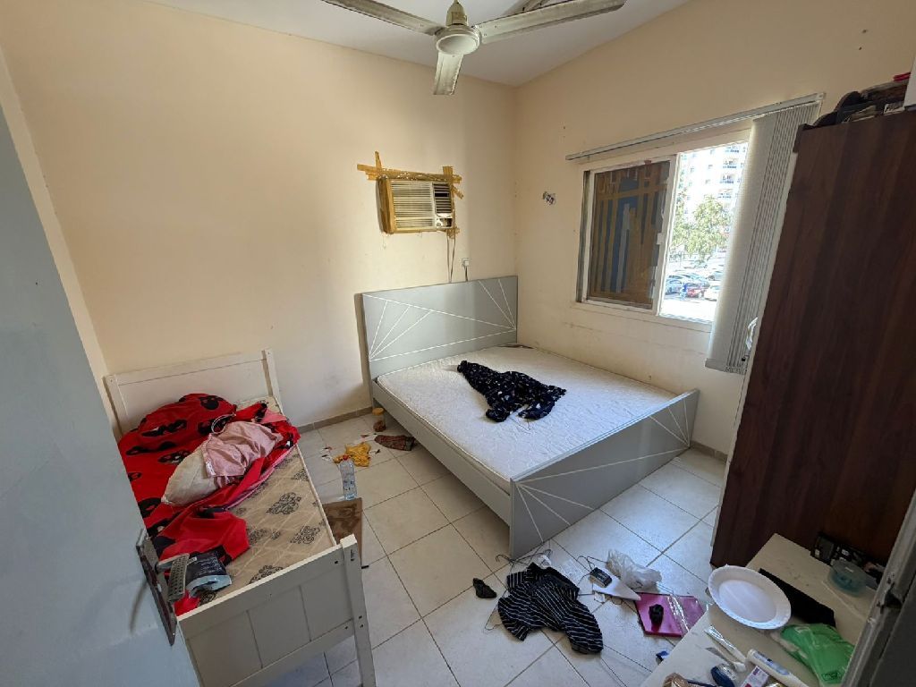 One - bedroom apartment for annual rent in Ajman, second row from Ajman Corniche. Spacious apartment with excellent finishes, balcony, and bright interior. Includes 1 bathroom and split AC system. Prime location close to the Corniche and all services. Annual rent AED25000 in 6 installments. Great value in a lively area Al Sharq Deman Company for Customer Excellence
