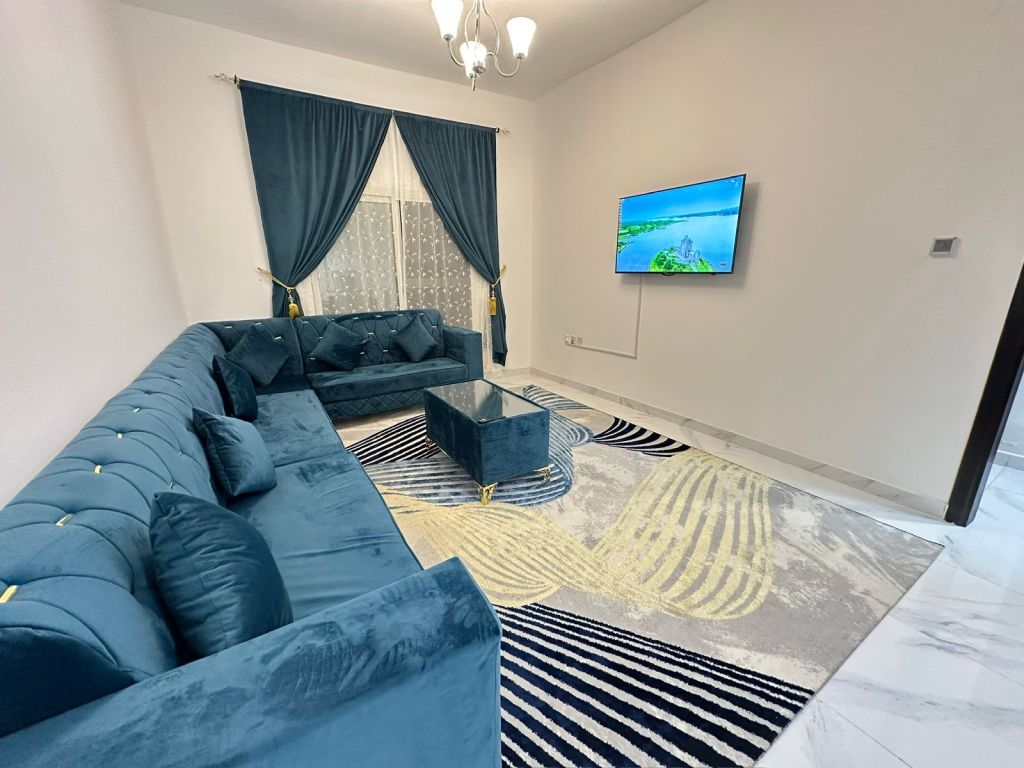 Apartment for rent in Ajman, Rashidiya 3, consisting of 1 bedroom and a living room. The apartment is located opposite Rashidiya Ladies parking, a lively area close to the Corniche. fully furnished with new furniture, featuring central air conditioning and a balcony. monthly rent AED3900 All utilities included with internet and maintenance, excluding
