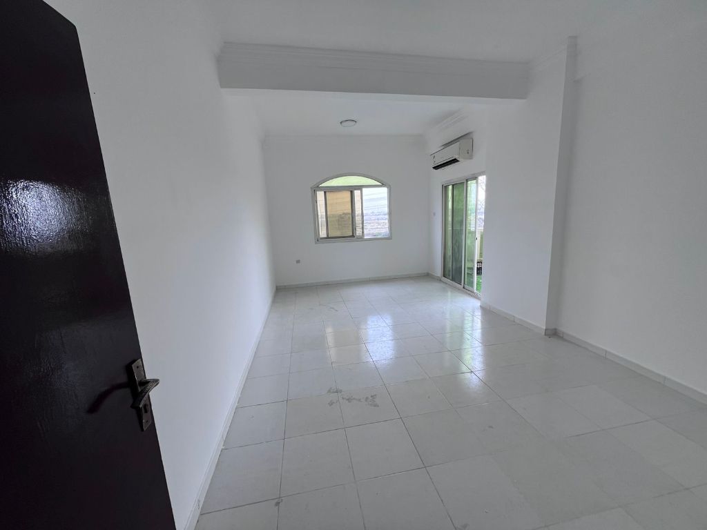 For annual rent. Excellent location. Two bedrooms and a living room in Al - Muwayhat, near Al Tallah Supermarket. Spacious. Families only. Split air conditioning. Beautiful building entrance. Price 35000. 4 installments. Security deposit (check required)