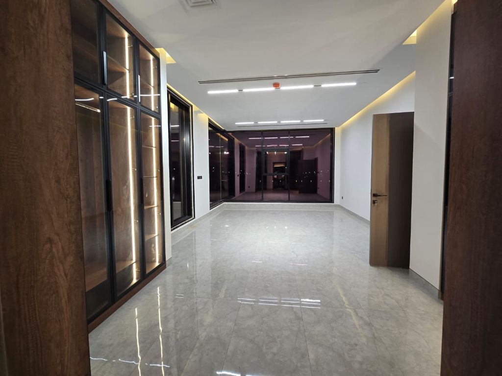 Luxury villa for sale in Al Houshi - Ajman, first tenant, 5 Smart home rooms with central AC and gas, full roof insulation. Includes swimming pool and garden. First floor Majlis with bathroom, living room with bathroom, large kitchen, master room, guard and secret room. Second floor bedrooms with bathrooms and closets, American prep kitchen, balcony. Storage on third floor. Price AED 6.5M for both