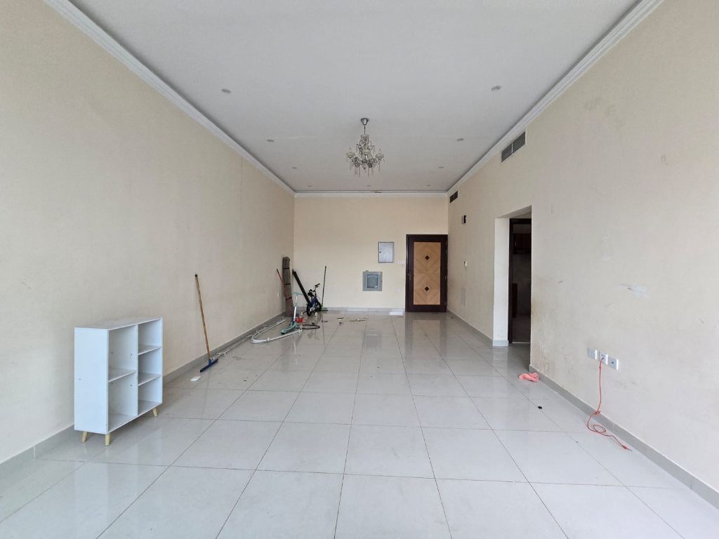 One - bedroom apartment for annual rent in Al Rawda, Ajman. Features include two bathrooms, a master bedroom, a panoramic window with an open view, and central air conditioning with full maintenance included. The rent is AED33000 per year, payable in six installments for easy payment. The apartment is conveniently located near Sheikh Ammar Street, Al Talhah Supermarket, and close to amenities and bus
