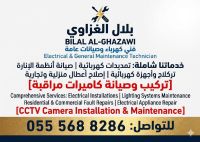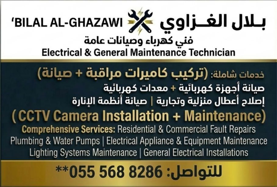 الأنظمة الأمنية تركيب وتبرمج وصيانة كاميرات المراقبة (Dahua, Hikvision, Uniview) وربطها بالهاتف. الأعمال الكهربائية تمديد وصيانة لوحات الكهرباء، اصلاح أعطال الانارة والدوائر الكهربائية. التكييف والتبريد صيانة دورية، تنظيف، واصلاح أعطال المكيفات لضمان أفضل أداء. صيانة عامة حلول مبتكرة للمظلات (الشادر) أعمال اللحام، وصيانة الاجهزة المنزلية