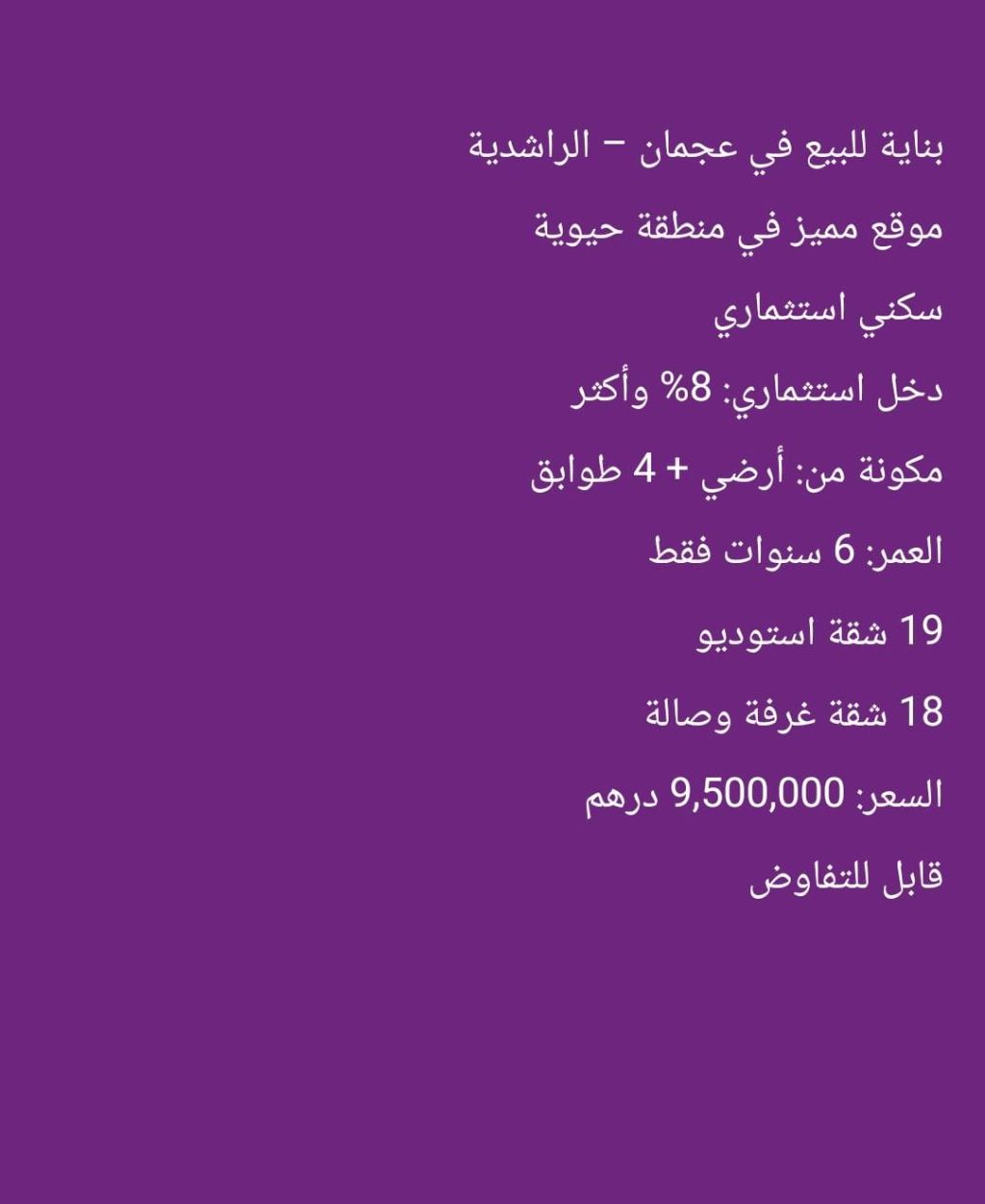 بناية للبيع في إمارة عجمان منطقة الراشدية 2 موقع ممتاز ومقابل مسجد العمر 5 سنوات مكونة من 19 استوديو 18 غرفة وصالة الدخل 850 ألف دخل استثماري 9% وأكثر جميع العقود تستحق الزيادة إيجارات قديمه مطلوب 9500000 قابل للتفاوض