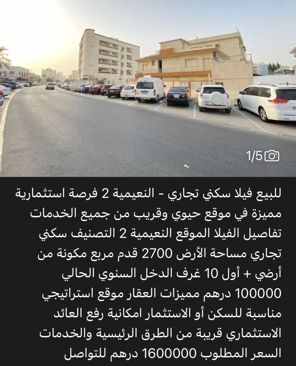 بناية تجاريه أرضي وأول في النعيمية مساحة 2700 دخل 130 بعد شهر 12 المتوقع مطلوب 1600000 قابل