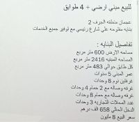 للبيع مبني أرضي + 4 طوابق عجمان منطقة الجرف 2 بناية مفتوحه على شارع الرئيسي تفاصيل بناية مساحة الأرض 600 متر مربع مساحة مبني 2416 متر مربع كل طابق حوالي 483 متر عمر مبني 5 سنوات غرفتين نوم 8 وحدات غرفة وصالة مع 2 حمام 4 وحدات غرفة وصالة مع حمام 4 وحدات عدد محلات 3 وحدات الدخل 658 ألف سنوي سعر البيع 8 مليون