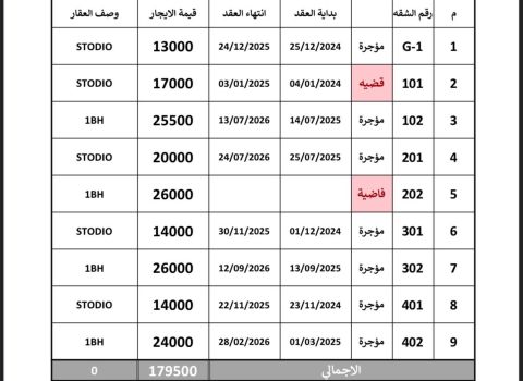 بناية استثمار في المويهات للبيع نسبة الدخل 11.5% 6 غرفة وصالة 4 غرفتين وصالة 2 استوديو مساحة الأرض 6200 قدم عمر البناية 5 سنوات البناية متاجرة بالكامل نظام شهري مفروش تفاصيل الإيجار 4 شقق غرفتين وصالة 4500 6 شقق غرفة وصالة 3200 2 استوديو 2000 متاجره مفروش وشامل الفواتير المالك بيدفع 500 درهم كهرباء والزيادة على المستأجر الاجمالي شهري 41 ألف و200 درهم سنوي 494 ألف و400 درهم السعر المطلوب 4 مليون 500