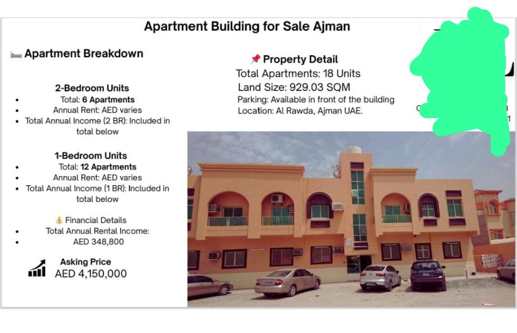 Residential Building for sale, Ajman Al Rawda 3 Property Details Total Apartments 18 units Two - Bedroom Units Land Area 929.03 SQM Total 6 apartments (2 bedrooms) One - Bedroom Units Total 12 apartments Financial Details Total Annual Rental Income AED348800 asking price AED4150000 Parking Available in front of the building Location Al Rawda