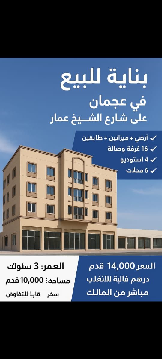 Building for sale in Ajman on Sheikh Ammar Street. Ground floor and mezzanine + 2 upper floors. 16 rooms and a hall. 4 studios. 6 shops. Price AED14 million (negotiable) Current income AED1100000 (current income) Contracts subject to increase. Direct from owner. 3 years old. Area 10000 SqFt