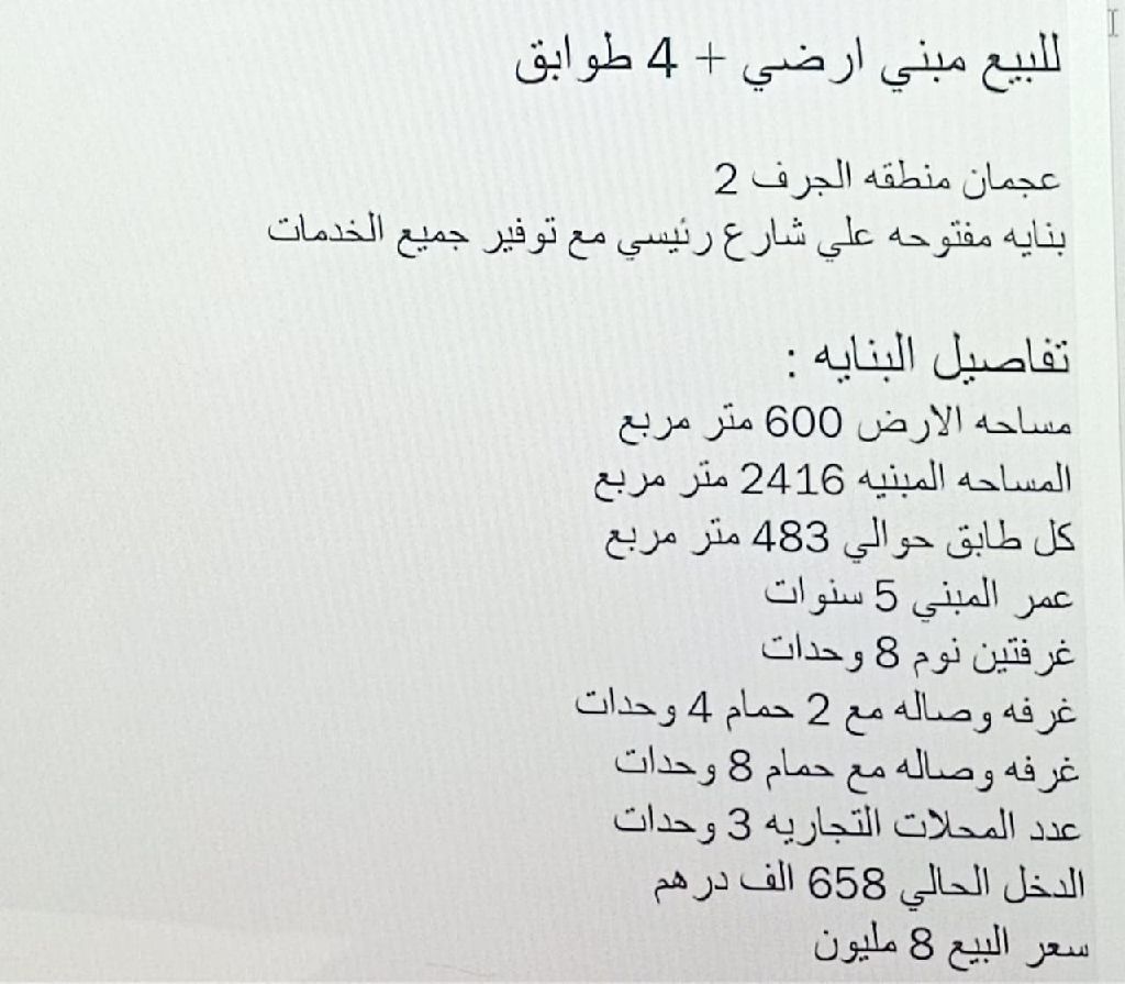 For sale Ground Floor + 4 Floors Building Ajman, Al Jerf 2 Area Building on the Main Street Building Details Land Area 600 SQM Building Area 2416 SQM Each Floor Approximately 483 SQM Building Age 5 Years 2 Bedrooms, 8 Units