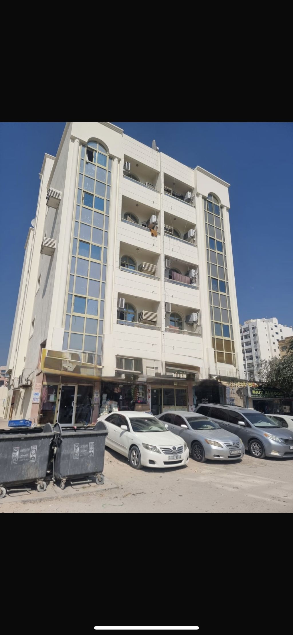 بناية في النخيل أرضي و4 مساحة 3600 مكونة من 4 محلات 18 شقة دخل 400 ألف العمر 12 سنة مطلوب 4 مليون و300 ألف