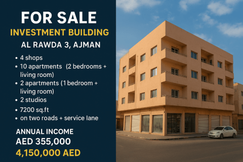 For sale - Investment Building in Al Rawda 3, Ajman Corner on Two Roads + Service Lane An excellent opportunity to acquire a residential & commercial investment building in Al Rawda 3 - Ajman, located on two main roads plus a service lane, offering high visibility and strong rental demand. Building Details Location Al Rawda 3, Ajman Plot Area 7200 SqFt Prime location on two roads + service lane