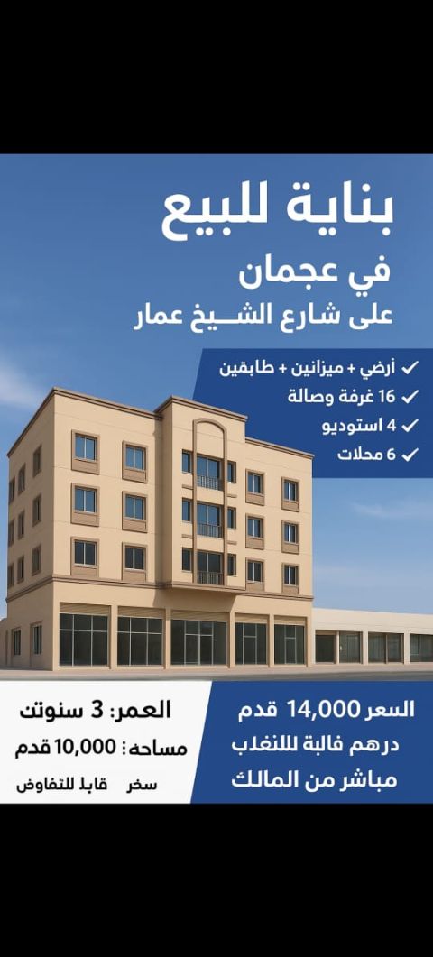 Brand new building for sale - Al Al Mwaihat 2, Ajman Main Street 9% Return Super deluxe building featuring 16 one - bedroom apartments, 16 two - bedroom apartments, 2 studios, 5 shops, a guard's room, and parking. Price AED19500000 (negotiable) Two vacant shops - an opportunity to increase income. Contact us