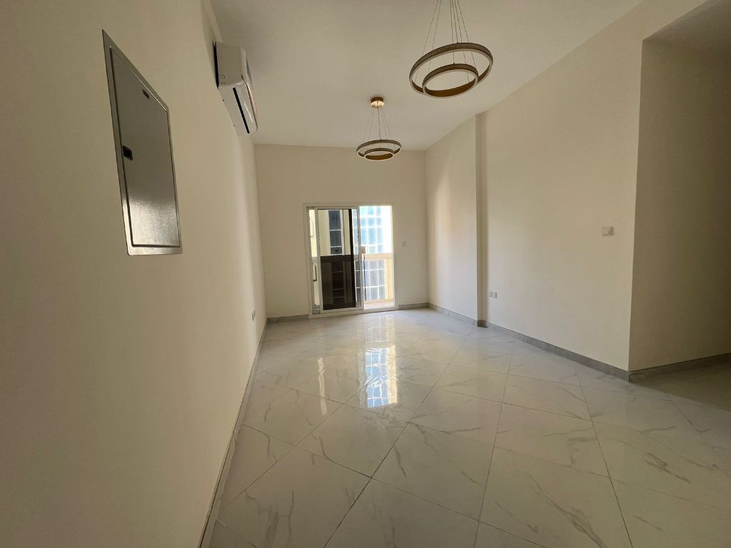 Brand new building, first occupancy, in Industrial Area 2, next to D2D and Nesto Hypermarket. Beautiful one - bedroom apartment with a living room, two bathrooms, and an excellent balcony with an open view. Very spacious, new split AC units, large and fully lit kitchen, super deluxe finishing. Prime location near all services, close to the bus station and Sheikh Mohammed Bin Zayed City Road, with easy