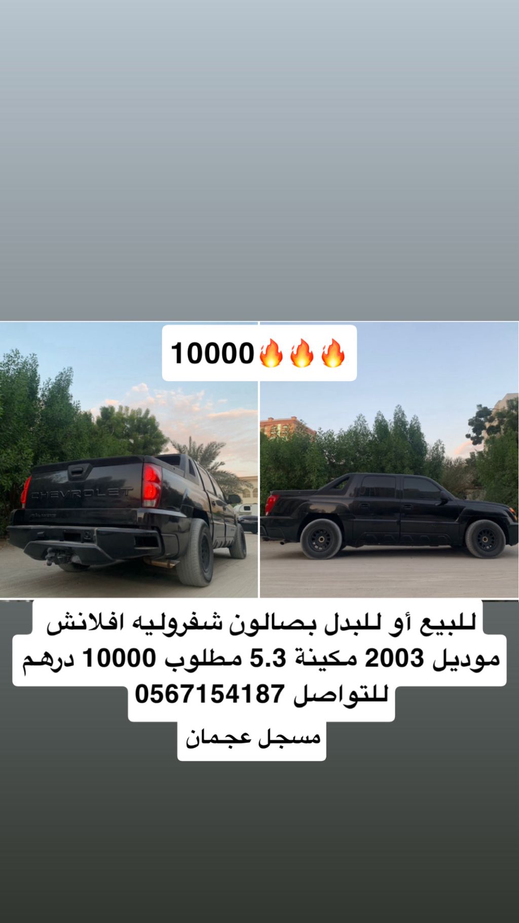 للبيع أو للبدل: شفروليه أفلأنش موديل 2003 بمحرك 5.3. المطلوب: 10,000 درهم. للتواصل: مسجل في عجمان.