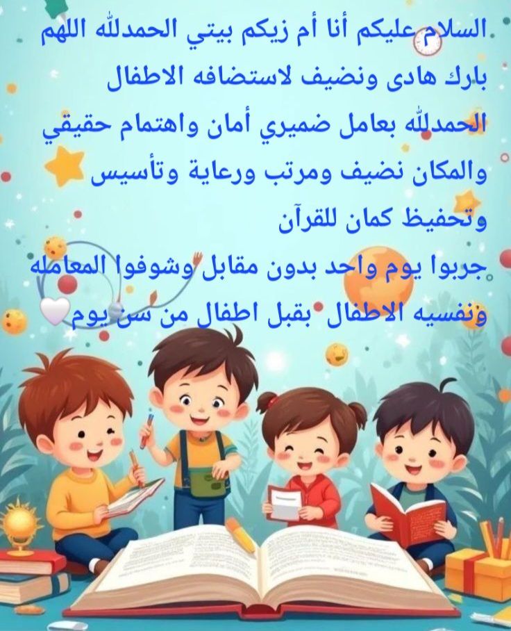 مساء الخير أنا أم زيكم بيتي الحمدلله اللهم بارك هادئ ونظيف لاستضافة الاطفال الحمدلله بعامل ضم يري أمان واهتمام حقيقي وال