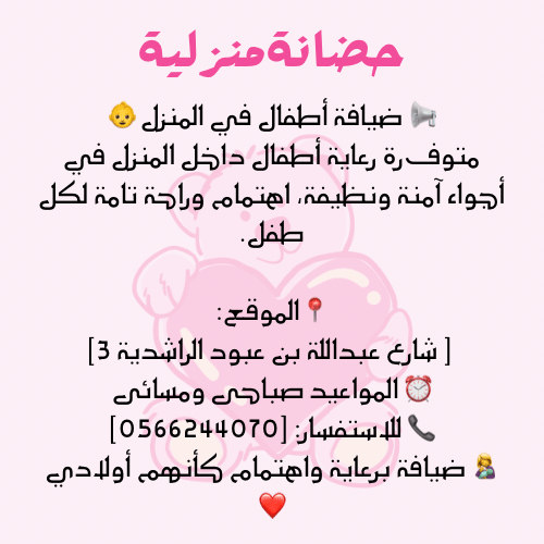 ضيافة اطفال في المنزل متوفرة رعاية اطفال داخل المنزل في أجواء آمنة ونظيفة، اهتمام وراحة تامة لكل طفل. حضانة منزلية