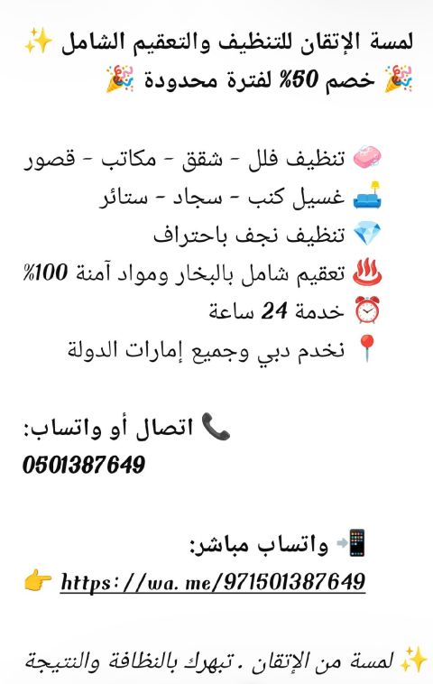خدمات تنظيف احترافية متوفرة نقدم خدمات تنظيف موثوقة للمنازل والمكاتب، مع فريق عمل مدرب ومعدات حديثة. تنظيف المنازل - تنظيف المكاتب والشقق - تنظيف الكنب - فريق عمل ملتزم بالمواعيد ومحترف مناطق الخدمة دبي، الشارقة، وعجمان للاستفسار عن التفاصيل والتوفر، تواصلوا معنا