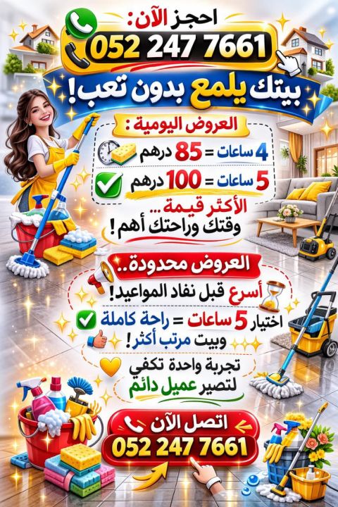 عرض تنظيف منازل 5 ساعات 99 درهم تنظيف الفلل الشقق المحلات التجاريه