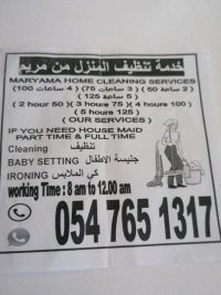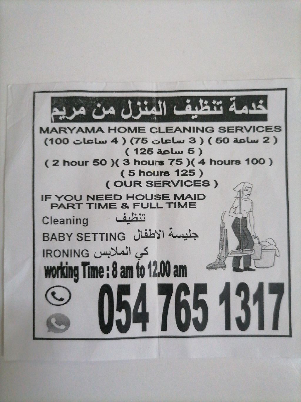Mareyem Home Cleaning Service (2 hours 50) 3 hours 75) 4 hours 100) 5 hours 125) OUR SERVISCE) if you need housemaid part time and full time Cleaning and baby Setting Ironing Working Time 8 am to 12. 00 Am)