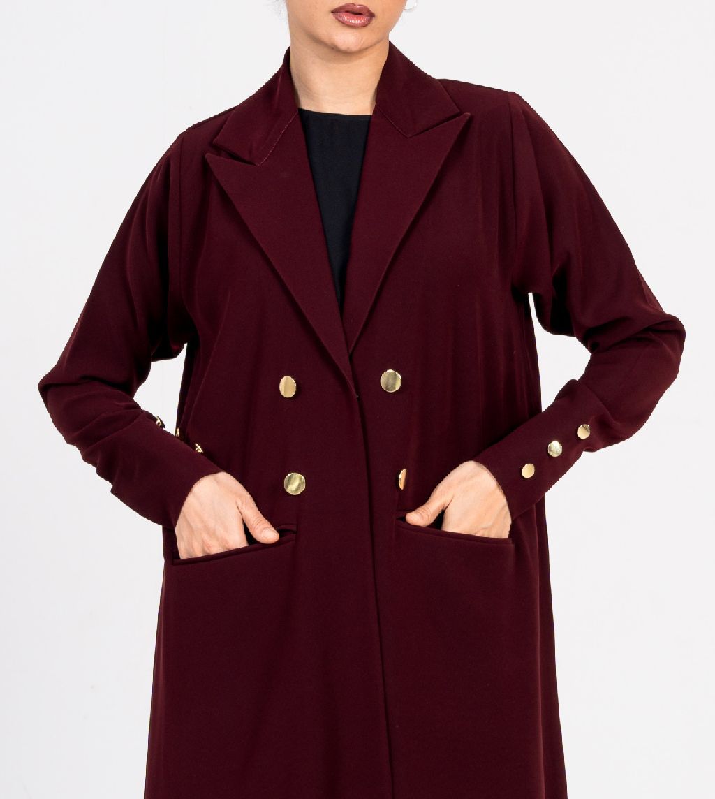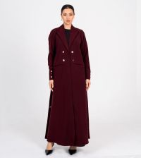 عباية بلايزر عنابي مع أزرار تتميز هذه العباءة بتصميم أزرار بلون الذهبي غني، وهي مستوحاة من الطراز الجاكيت الفاخر، تجمع بين الأناقة العصرية والموضة المحتشمة. مثالية للمناسبات الرسمية واليومية. AED350