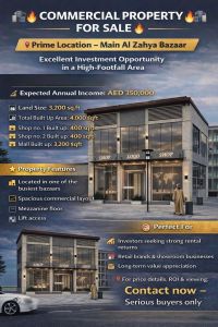 Invest in a brand - new commercial building in the heart of Zahya, Ajman, located in one of the busiest bazaars offering high foot traffic and excellent business visibility. Property Details Land Size 3200 SqFt. Total Built - Up Area 4000 SqFt. Shop 1 400 SqFt. Shop 2 400 SqFt. Mall Area 3200 SqFt. Mezzanine Floor for additional space Lift Access for convenience Price AED3200000 (AED800/ SqFt