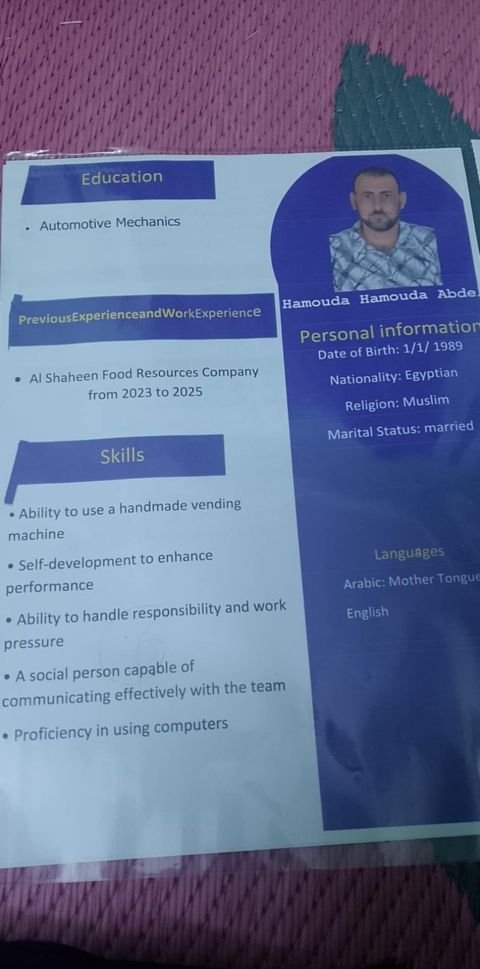 أنا اسمي يوسف طارق أحمد أنا خريج بكالوريوس تجارة قسم محاسبه عملت في مصر لمدة سنتين محاسب تحصيلات لدي شركة عقارات عملت سيلز لمدة سنة لدي شركة عقارات عملت محلل كرة قدم لمدة سنة لدي شركة ستاتس بومب عملت لدي R O Z شركة موبايلات وشحن لمدة 10 أشهر في دبي عملت لديها أكثر من شيء محاسب فواتير ومحاسب عملاء وعملت خزنة معي إقامة على الشركة القديمه صالحة لمدة سنة و3 شهور